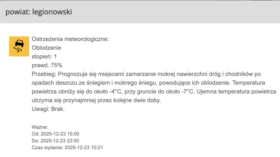 Najnowsze ostrzeżenia przed oblodzeniem I stopnia zostały wydane dla województw: warmińsko-mazurskiego, podlaskiego, lubelskiego, mazowieckiego, łódzkiego, kujawsko-pomorskiego, pomorskiego, wielkopolskiego, a także znacznej części woj. świętokrzyskiego.