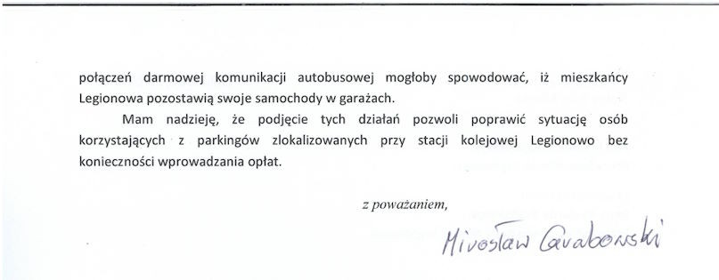 Dziękuje za odpowiedź. Mam nadzieje że będzie Pan bronił interesów gminy Legionowo bo jeśli chodzi o Wieliszew to wójt sobie poradzi. Brakuje miejsc parkingowych dla mieszkańców Legionowa na parkingu znajdującym się na terenie naszego miasta.