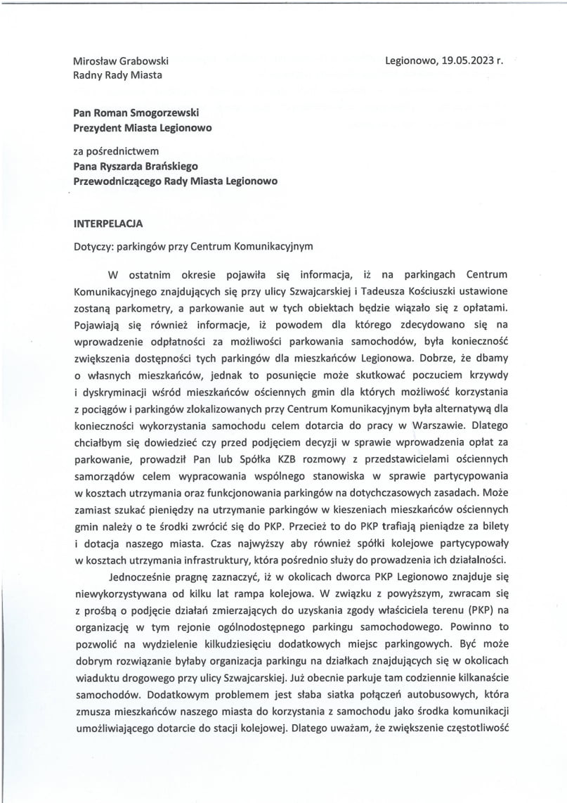 W swoim piśmie do prezydenta Legionowa radny Mirosław Grabowski zauważa, że choć wprowadzenie opłat za korzystanie z parkingów przy dworcu PKP w Legionowie ma na celu zwiększenie dostępności miejsc postojowych dla mieszkańców Legionowa, to jednak może wywoływać poczucie krzywdy i dyskryminacji dla osób z innych gmin. Zdaniem opozycyjnego radnego, możliwość bezpłatnego korzystania z miejsc postojowych jest dla mieszkańców ościennych gmin alternatywą wobec podróży do pracy w Warszawie własnym samochodem.
