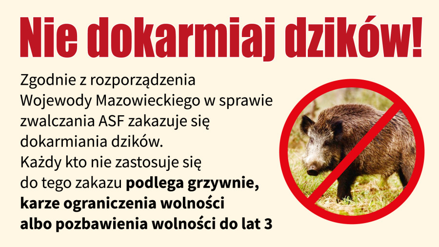 Jak informuje Urząd Miasta Legionowo na swoim profilu w Portalu Społecznościowym Facebook, zgodnie z rozporządzeniem Wojewody Mazowieckiego w sprawie zwalczania ASF zakazuje się dokarmiania dzików. Każdy kto nie zastosuje się do tego zakazu podlega grzywnie, karze ograniczenia wolności albo pozbawienia wolności do lat 3.