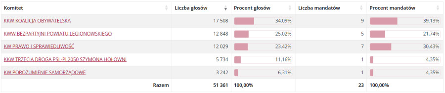 Liczba mandatów przypadających na poszczególne komitety wyborcze:
