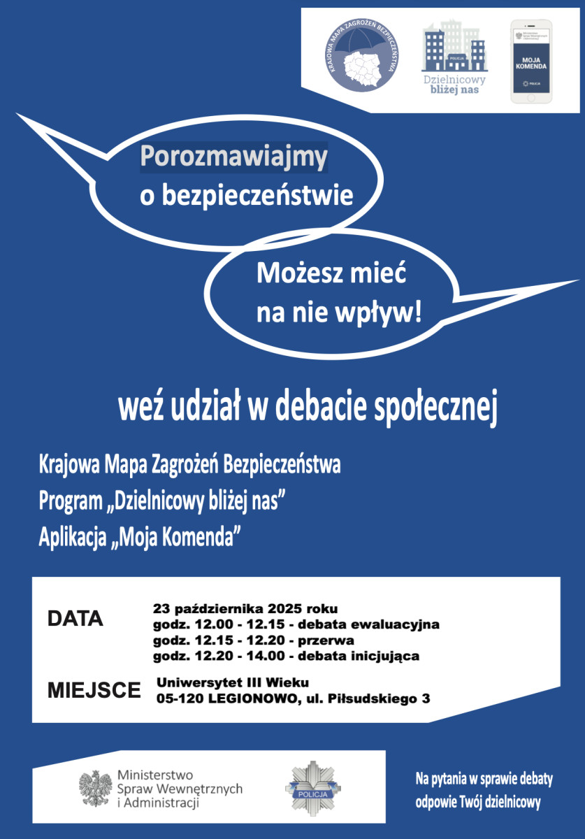 Debata społeczna na temat bezpieczeństwa odbędzie się w czwartek, 23 października w siedzibie Uniwersytetu III Wieku, przy ul. Piłsudskiego 3 w Legionowie. Początek zaplanowano na godz. 12:00.