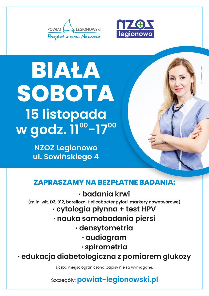 Jak informuje w komunikacie Starostwo Powiatowe w Legionowie, które jest organem prowadzącym przychodnię, Biała Sobota to doskonała okazja, aby bez wcześniejszej rejestracji wykonać ważne badania, skonsultować się ze specjalistami i uzyskać fachową wiedzę na temat profilaktyki zdrowotnej.