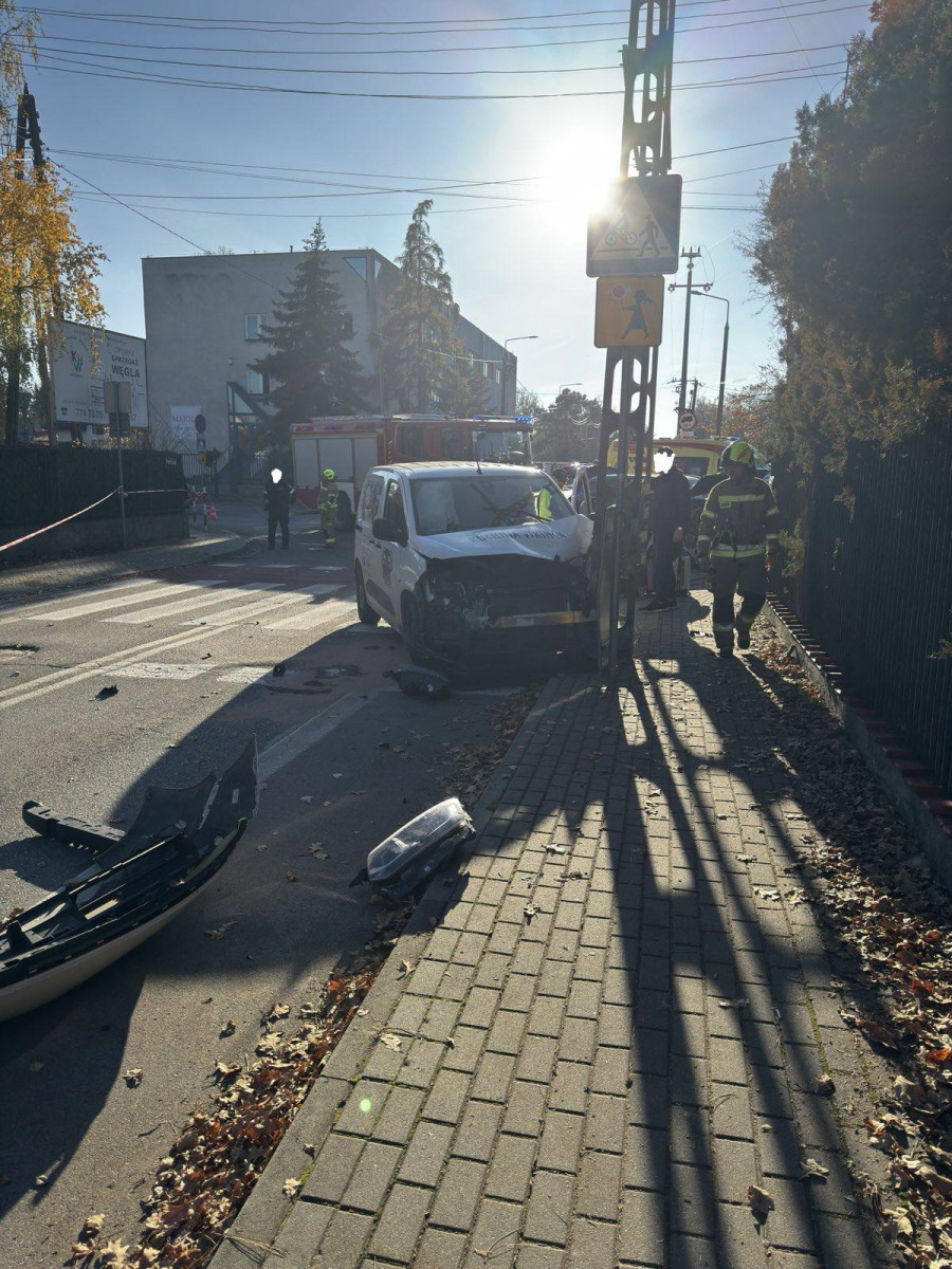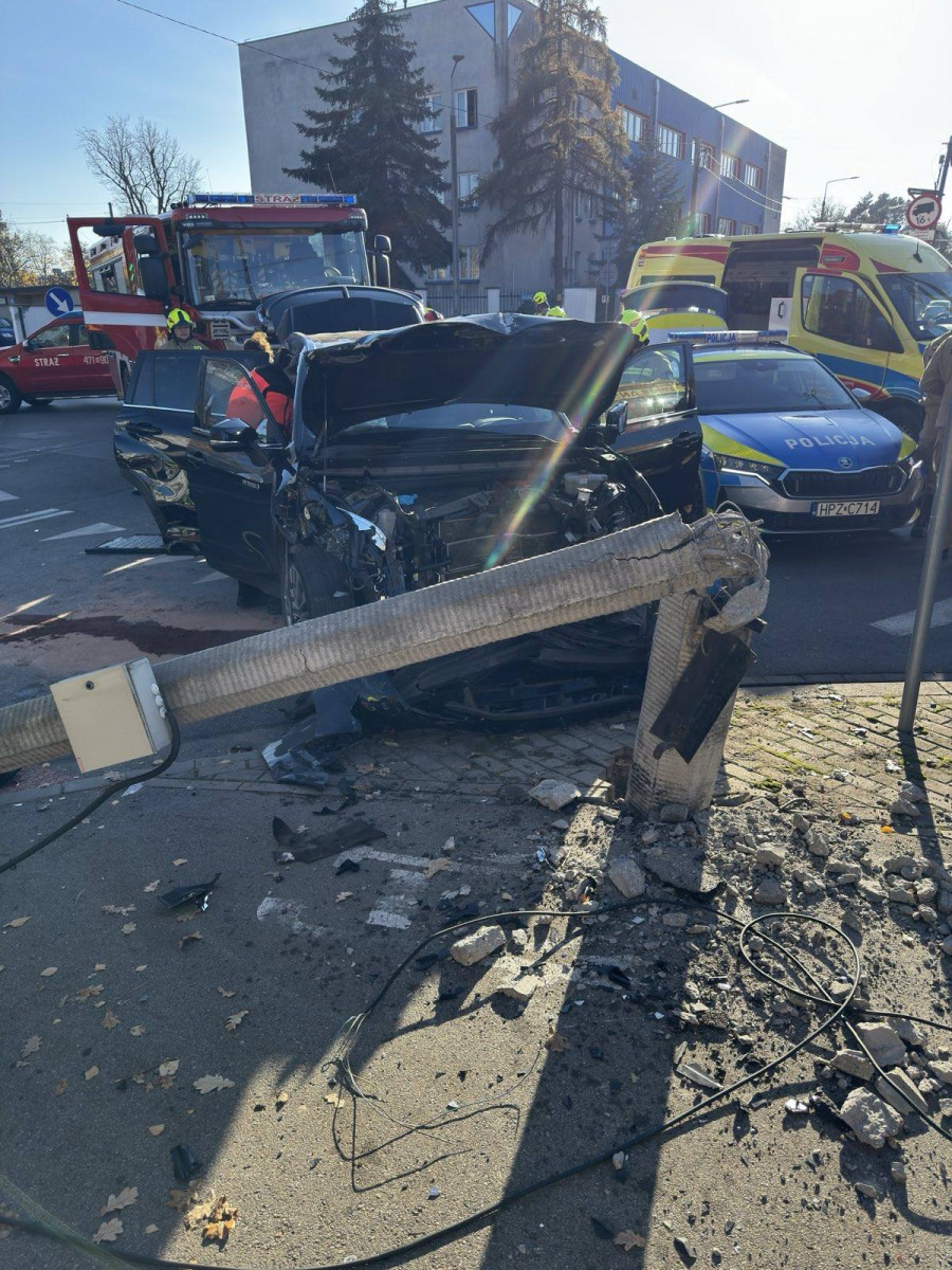 W wyniku zderzenia pojazdów zniszczona została latarnia uliczna, na której zwieszona była kamera miejskiego monitoringu.