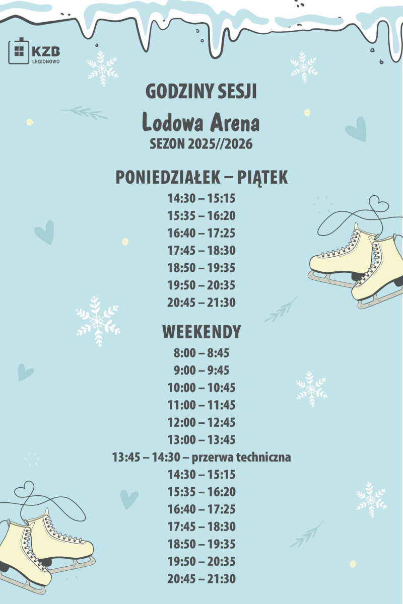 Jak zaznacza w komunikacie spółka KZB Legionowo, otwarcie Lodowej Areny odbędzie się 6 grudnia o godz. 17:00. Na początek zaplanowano animacje i zabawy dla najmłodszych, a następnie – dyskotekę na lodzie z muzyką prezentowaną przez DJ-a. Uczestnicy będą mogli skorzystać z fotobudki 360, a na miejscu dostępne będą gorąca herbata i czekolada. Pierwsze 200 osób otrzyma czapeczki św. Mikołaja. Tego dnia wstęp na lodowisko będzie bezpłatny.