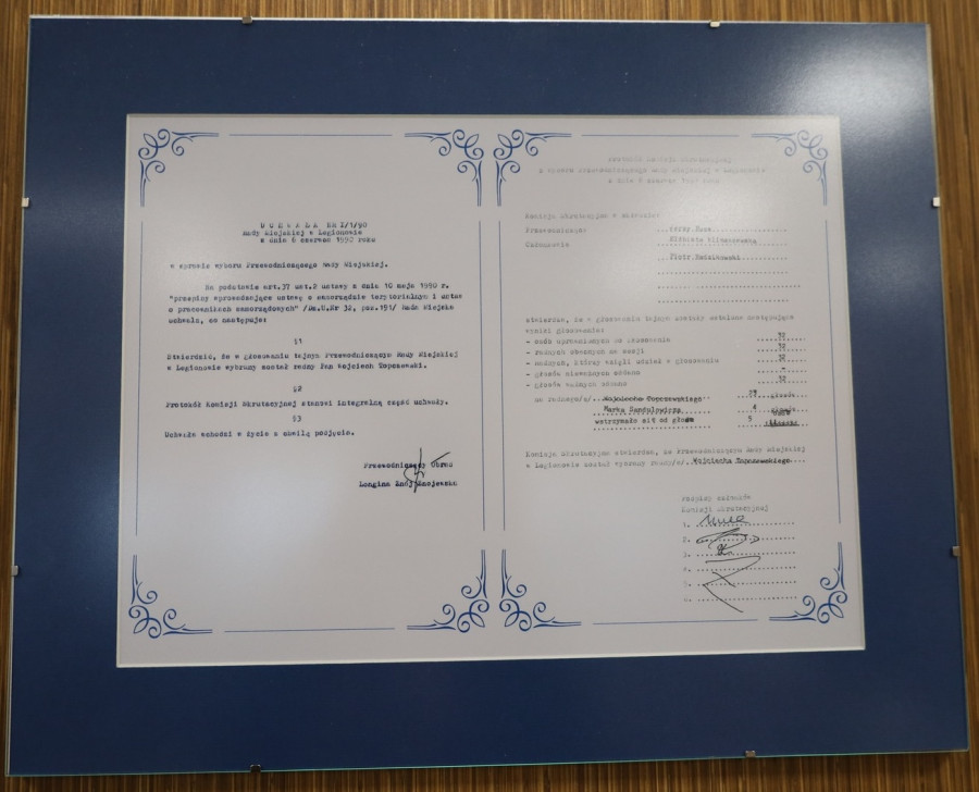 Jak informuje w komunikacie legionowski ratusz, historyczny dokument został zawieszony na ścianie sali konferencyjnej wspólnie przez Prezydenta Miasta Bogdana Kiełbasińskiego, Przewodniczącego Rady Miasta Ryszarda Brańskiego oraz pierwszego przewodniczącego legionowskiej rady – Wojciecha Topczewskiego.
