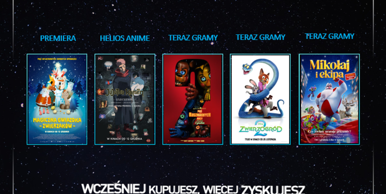 Sieć przygotowała również seanse dla fanów japońskiej animacji w ramach cyklu Helios Anime. W dniach 12-18 grudnia we wszystkich kinach odbędą się projekcje tytułu „Jujutsu Kaisen: Execution Shibuya Incident x The Culling Game Begins”. Kulminacją filmu, który podsumowuje dotychczasowe wydarzenia z serialu, jest dramatyczny pojedynek dwóch ulubionych uczniów Gojō. To wstęp do trzeciego sezonu anime, prezentowany przedpremierowo w kinach!