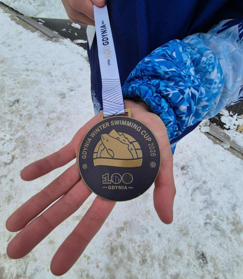 Pamiątkowy medal Gdynia Winter Swimming Cup 2026 wylicytowała za kwotę 500 zł Pani Edyta Niedźwiedzka. Jej decyzją krążek pozostanie fizycznie u Filipa.