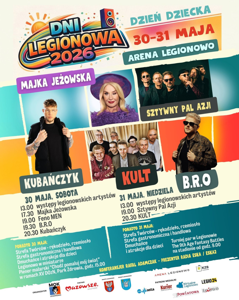 Miejski Ośrodek Kultury w Legionowie odkrył wszystkie karty dotyczące największego miejskiego wydarzenia plenerowego. Tegoroczna edycja, zaplanowana na weekend 30–31 maja, zapowiada się jako kompilacja obchodów Dnia Dziecka, promocji lokalnej twórczości oraz koncertów największych gwiazd polskiej sceny muzycznej. Całość wydarzenia na placu przy Arenie Legionowo poprowadzi Rafał Adamczak, prezenter Radia Eska.