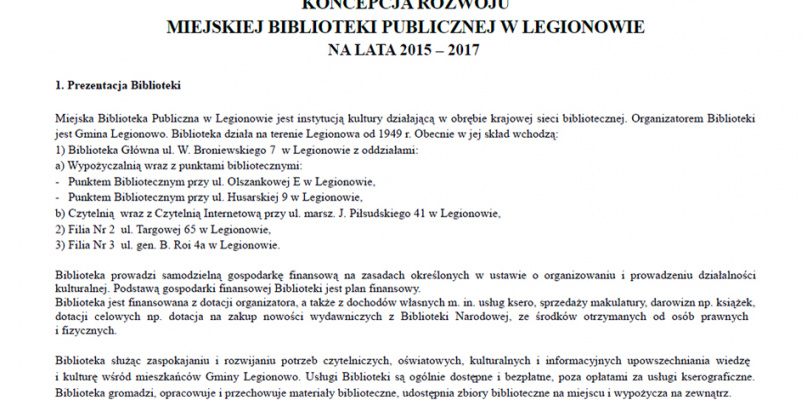 Podstawowym dokumentem, nad którym debatował zespół to "Koncepcja Rozwoju Miejskiej Biblioteki Publicznej w Legionowie na lata 2015-2017". Autorem opracowania jest jedna z pracownic legionowskiej biblioteki Lidia Maj. Pod koncepcją podpisała się również dyrektor biblioteki Izabela Kruszewska. Dokument wraz z uwagami mieszkańców i zespołu ds. biblioteki zostanie przekazany prezydentowi Legionowa oraz Komisji ds. Oświaty, Kultury i Sportu i posłuży do stworzenia strategii rozwoju biblioteki na przyszłe lata, którą kierować się będzie Rada Miasta Legionowo.
