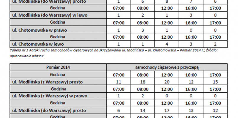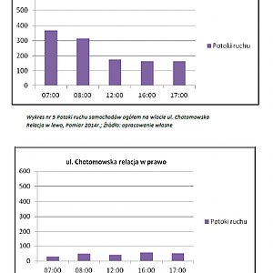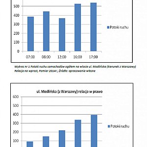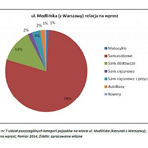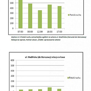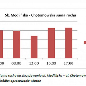 Mgr inż. Krzysztof Nadany oraz mgr inż. Przemysław Panek - autorzy opracowania - stwierdzili, że w tym rejonie najwięcej porusza się samochodów osobowych, a dominująca relacja na skrzyżowaniu ul. Modlińskiej z ul. Chotomowską to relacja na wprost w ciągu ul. Modlińskiej (DW 630). Tam potoki ruchu w godzinie szczytowej przekraczają 500 pojazdów na godzinę (zarówno w relacji do, jak i z Warszawy).
