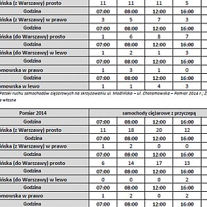 Pomiar ruchu został wykonany 6 maja 2014 roku w wybranych godzinach - tj. od 7:00 do 9:00, od 12:00 do 13:00 oraz od 16:00 do 18:00. Uwzględniono także wahania ruchu związane z występowaniem godzin szczytu (zarówno porannego, jak i popołudniowego). Pomiar odbywał się z zachowaniem interwału 15 minutowego oraz brał pod uwagę takie kategorie pojazdów jak: motocykle, samochody osobowe, dostawcze, ciężarowe z przyczepą, autobusy, rowery i inne. Badania podzielono na trzy części: wlot ul. Modlińska (DW 630) kierunek z Warszawy (relacja na wprost, relacja w prawo), wlot ul. Modlińska (DW 630) kierunek do Warszawy (relacja na wprost, relacja w lewo) oraz wlot ul. Chotomowska (relacja w prawo na ul. Modlińską - relacja w lewo na ul. Modlińską).