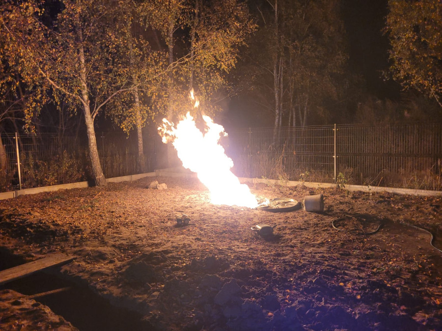 Strażacy, którzy przyjechali do zdarzenia jako pierwsi, zastali na miejscu pożar strumieniowy gazu - 100 proc. propanu, wydobywającego się z zaworu podziemnej butli. Płomień miał wysokość ok. 1 metra.