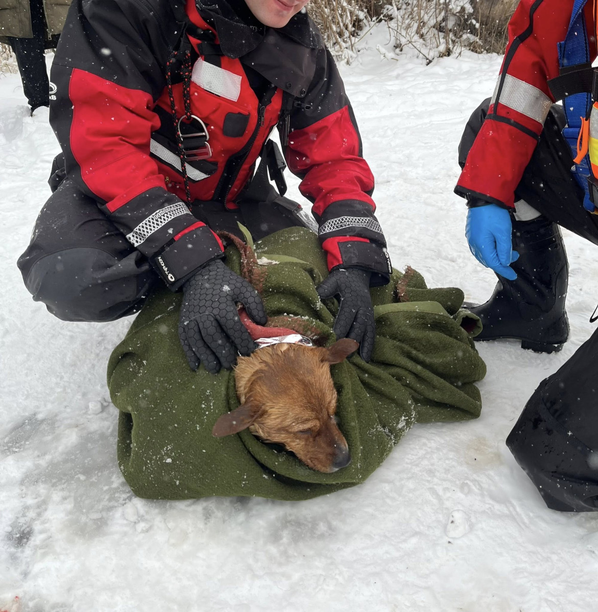 Po dotarciu na miejsce ratownicy zabezpieczeni w ubrania do pracy w wodzie, kamizelki asekuracyjne i szelki, wydobyli psa na ląd. Jak przekazał dyżurny, zwierzę nie odniosło obrażeń. Po wyciągnięciu z wody pies został wytarty i ogrzany w samochodzie ratowniczym.