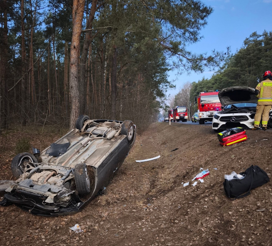 W chwili przybycia straży pożarnej, samochód osobowy marki mercedes znajdował się częściowo na jezdni, natomiast honda po zderzeniu wpadła do rowu i dachowała.