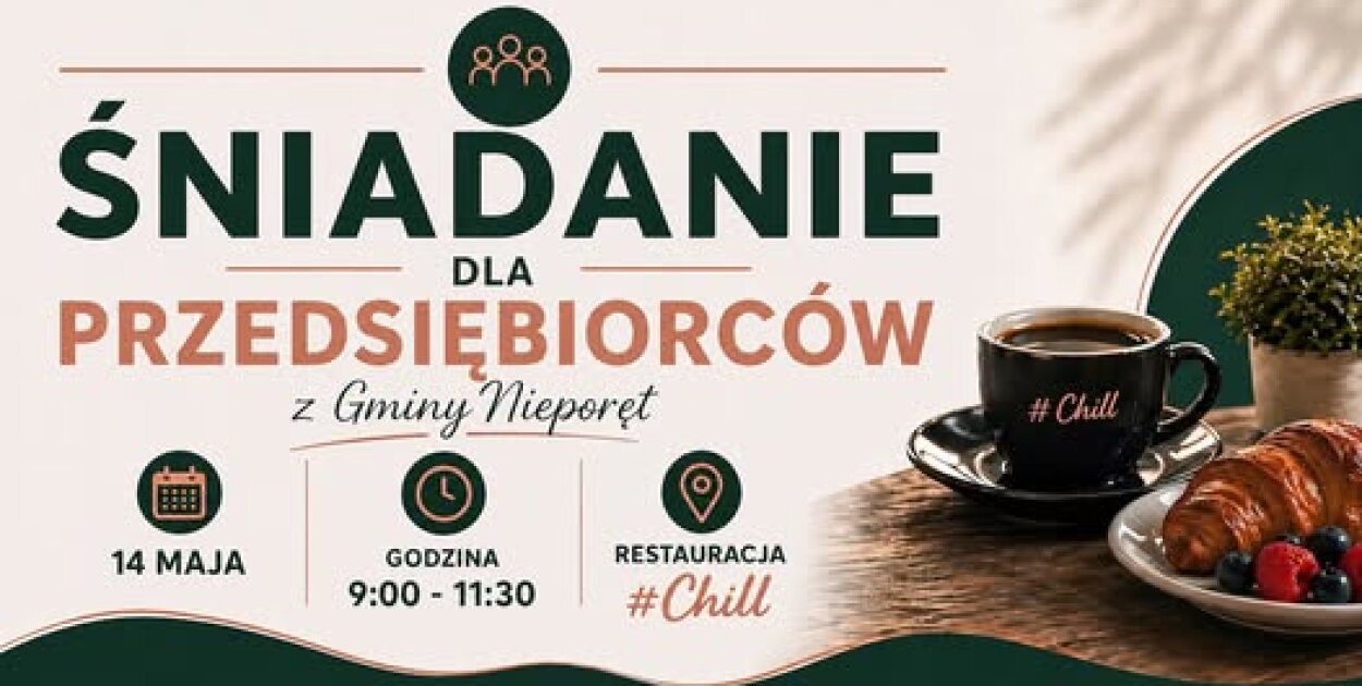 Śniadanie przedsiębiorców gminy Nieporęt odbędzie się w czwartek, 14 maja, w godzinach od 9:00 do 11:30, w Restauracji Chill, przy ul. Zegrzyńskiej 75 (w pobliżu Dzikiej Plaży).