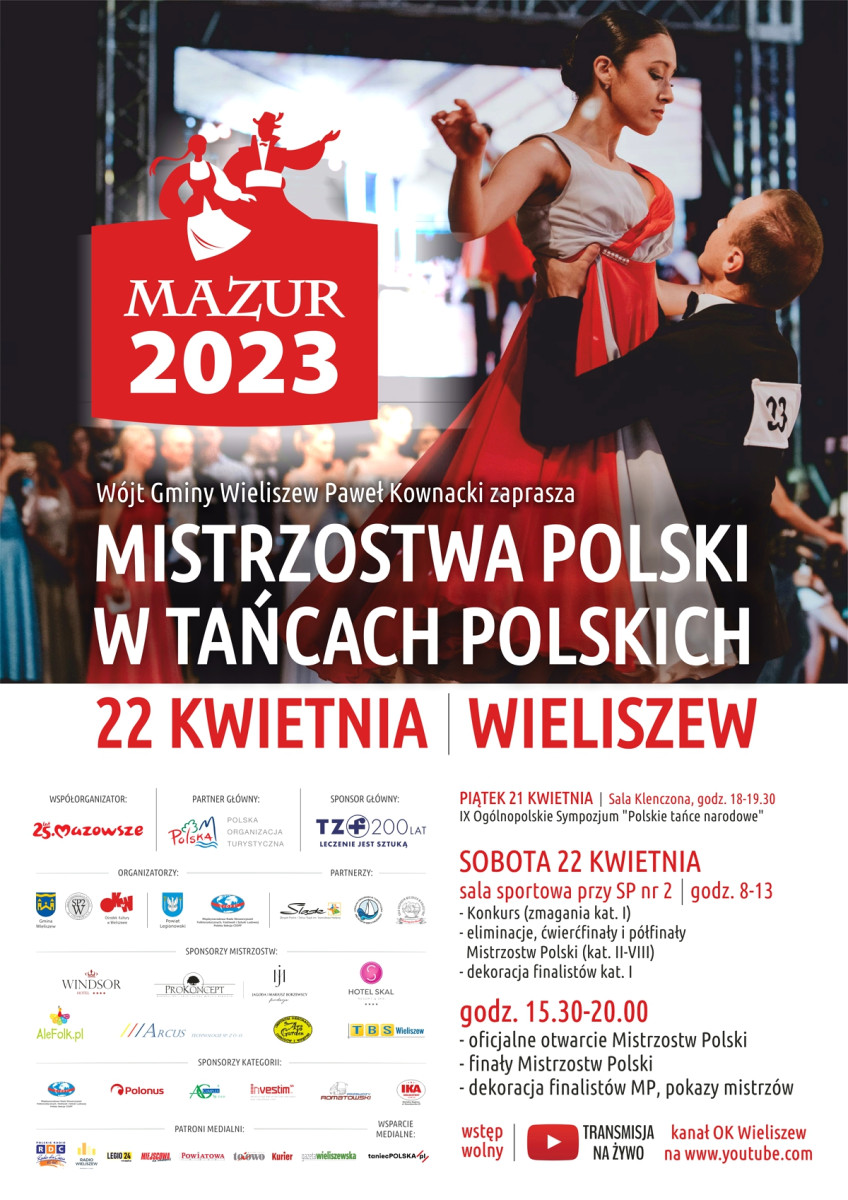 W najbliższą sobotę (22.04) w Wieliszewie odbędą się 22. Mistrzostwa Polski w Tańcach Polskich. Mistrzostwa, które co roku organizowane są pod nazwą “Mazur” będą gościć w powiecie legionowskim już po raz 15. Na hali sportowej przy Szkole Podstawowej nr 2 zaprezentuje się aż 119 najlepszych par tanecznych z 25 ośrodków z całej Polski.
