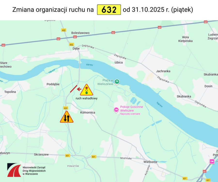 Przypomnijmy - na drodze wojewódzkiej nr 632 prowadzone są obecnie dwa odrębne remonty. Wymianę nawierzchni na odcinku od zapory w Dębem do ronda w Poniatowie realizuje firma Strabag, natomiast przebudowę przepustu przy zaporze w Dębem wykonuje Przedsiębiorstwo Robót Inżynieryjnych DIAG-MOST z Warszawy. Oba zadania zostały zlecone przez Mazowiecki Zarząd Dróg Wojewódzkich, który odpowiada za tą arterię.