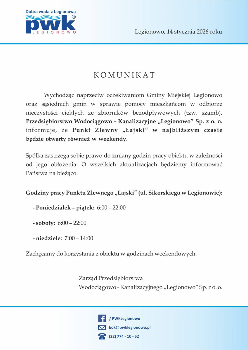 Jak poinformowało w środę, 14 stycznia Przedsiębiorstwo Wodociągowo-Kanalizacyjne „Legionowo”, wychodząc naprzeciw oczekiwaniom Gminy Miejskiej Legionowo oraz sąsiednich gmin, Punkt Zlewny „Łajski” w Legionowie będzie w najbliższym czasie otwarty również w weekendy. Spółka zastrzega przy tym możliwość zmiany godzin pracy obiektu w zależności od jego obłożenia.