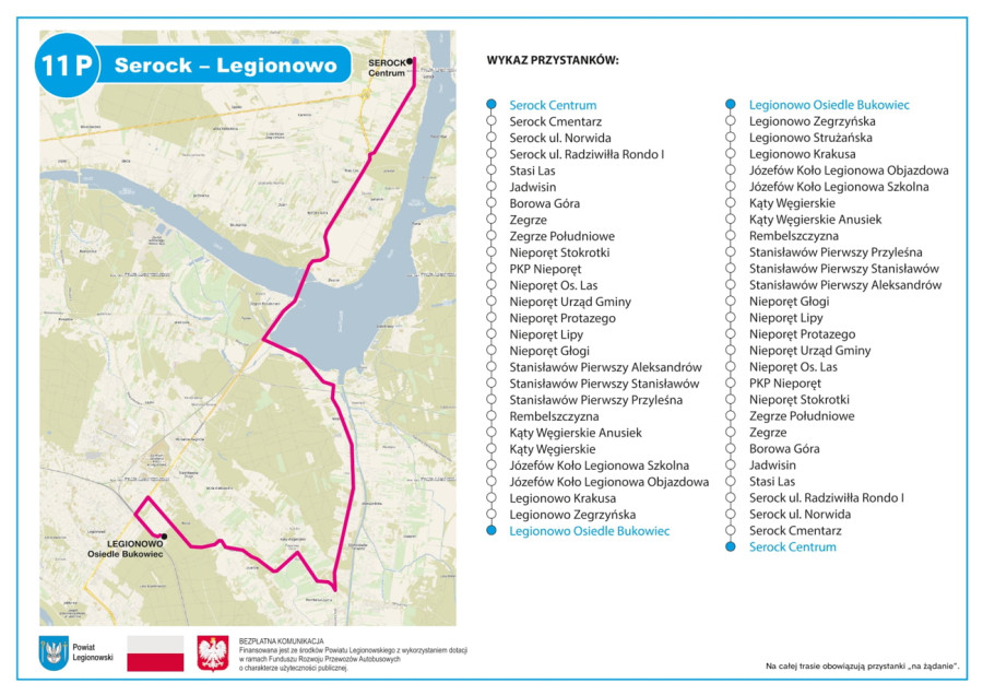 Od piątku (2.01) na trasę wyjechał autobus oznaczony numerem 11P, którym mieszkańcy Serocka dojadą do Legionowa. Utworzenie tej linii poprawiło skomunikowanie miejscowości położonych w północnej części powiatu oraz zapewniło lepszy dojazd uczniów w terenu gminy Serock do Liceum Ogólnokształcącego im. Stanisława Lema w Stanisławowie Pierwszym.