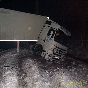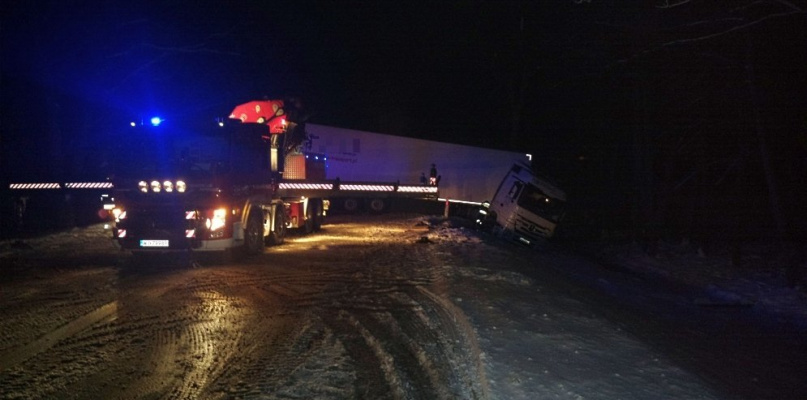 Do groźnie wyglądającej kolizji doszło w nocy z niedzieli na poniedziałek (26/27.01) w Wólce Radzymińskiej (gmina Nieporęt). Najprawdopodobniej w wyniku trudnych warunków na drodze, kierowca ciężarówki nie zapanował nad pojazdem i wjechał do przydrożnego rowu. Na szczęście nie odniósł żadnych obrażeń.