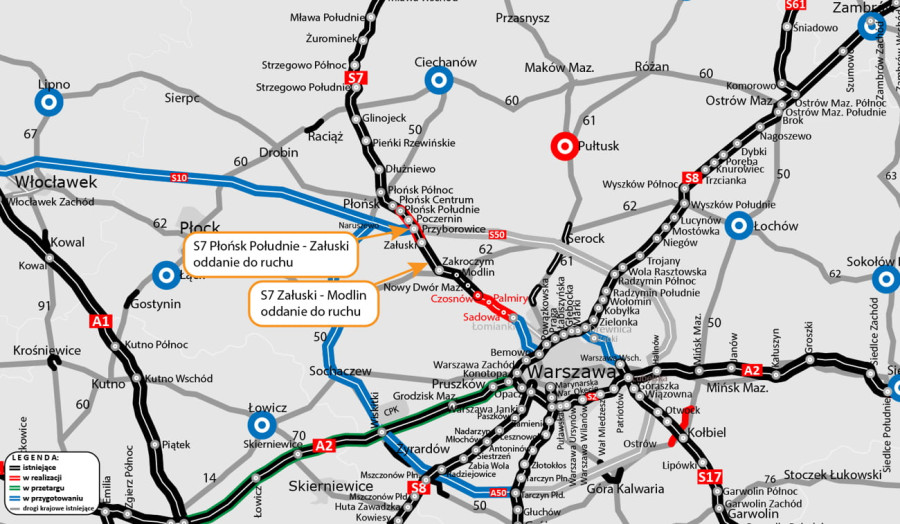 W piątek do ruchu oddano fragmenty Płońsk Południe – Załuski (12,9 km) oraz Załuski – Modlin (12 km). Wcześniej, pod koniec października, udostępniono 9,7 km trasy Modlin – Czosnów.