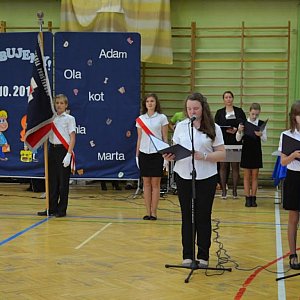 Uczniowie najstarszej klasy gorąco i serdecznie przywitali pierwszoklasistów zapewniając ich, że zawsze będą służyć im pomocą. Pierwszaki dzielnie przeszły próby mądrości, zdrowia i uśmiechu, złożyły meldunek o gotowości do ślubowania, a następnie wyrecytowały słowa przysięgi i zostały pasowane na uczniów Szkoły Podstawowej nr 7 im. VII Obwodu "Obroża" Armii Krajowej.
