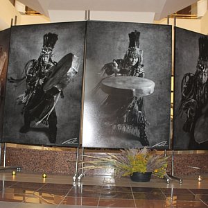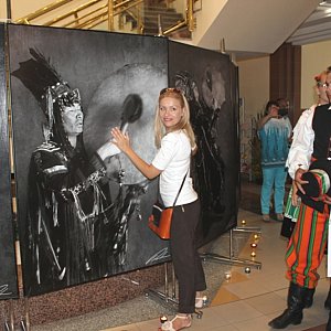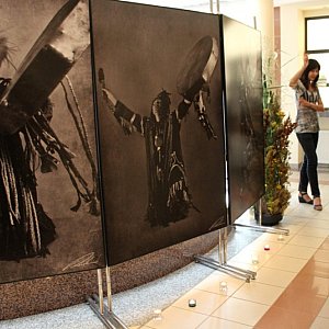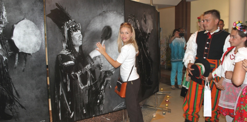 Tuż po tym spotkaniu w holu ratusza odbył się w wielonarodowościowym składzie wernisaż wystawy "Przewodnicy dusz" na którym fotografik - Marta Rosolska - zaprezentowała 12 unikatowych, wielkoformatowych, czarno - białych portretów szamanów tuwińskich z syberyjskiej krainy.
